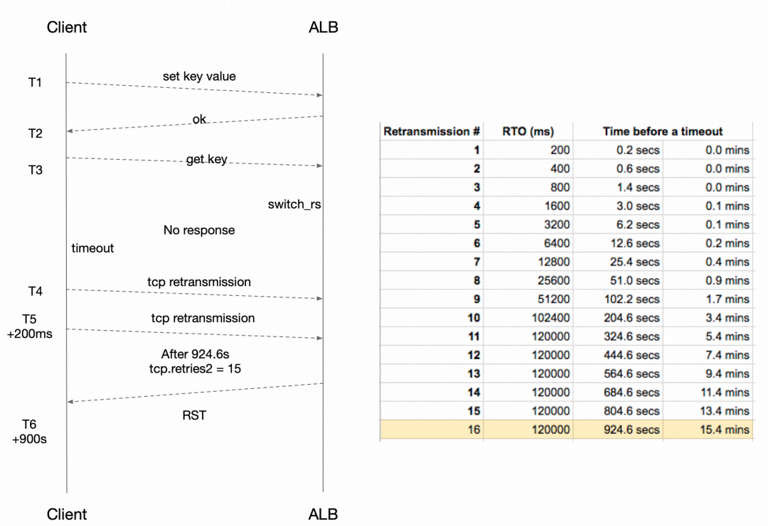 T6:此时还在 tcp retran,但是因为到达 Ali-LB est_timeout 时间,因此 Ali-LB 回复了 RST 回来,客户端就会恢复了。那如果 Ali-LB 一直不回复 RST,重传结束之后,TCP 也是会主动断开重连的,也可以恢复。