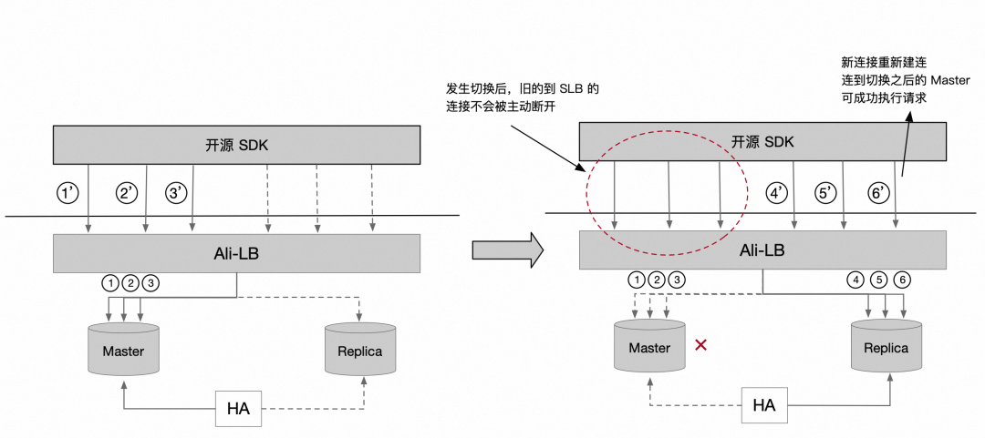 HA 组件探测 Master 宕机,调用 Ali-LB switch_rs 接口,将后端的连接从 Master 切换到 Replica。