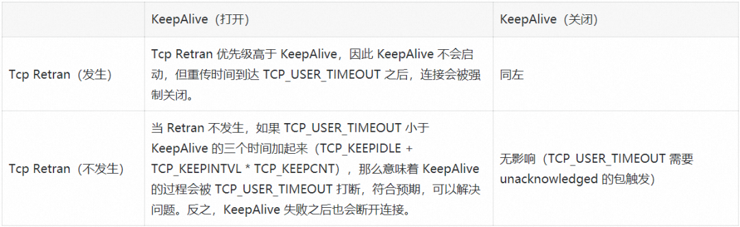 结论是不行,因为 TCP Retransmission Package 的优先级高于 KeepAlive,即如果是一个活跃连接,当此问题出现时候,会先开始 TCP Retran,具体取决于 tcp_retries23 参数(默认 15 次,需要 924.6 s)。