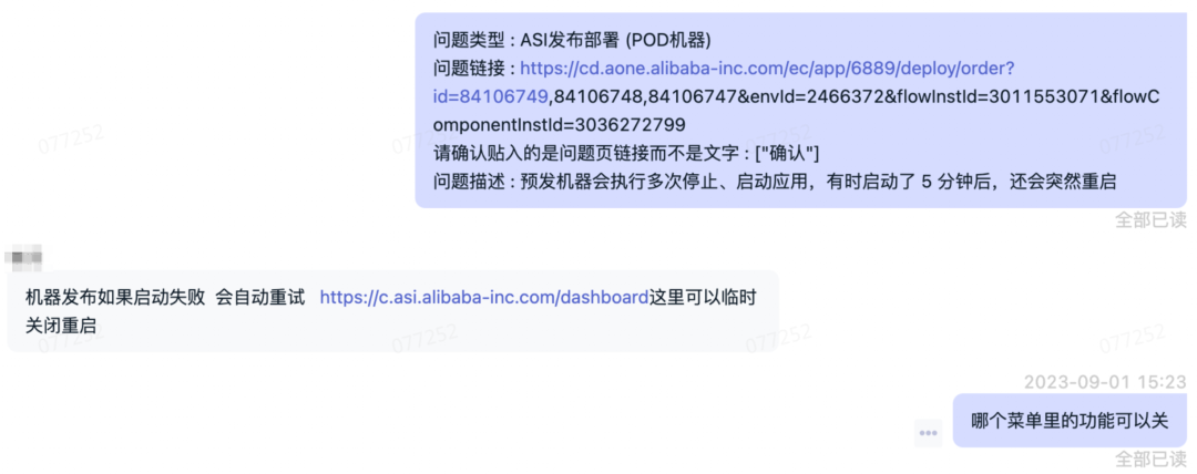 Aone(阿里内部 CI/CD 系统) 右下角咨询了研发小蜜,很快就有了答复。