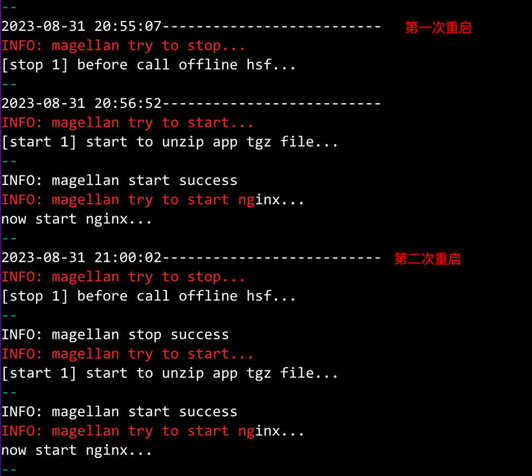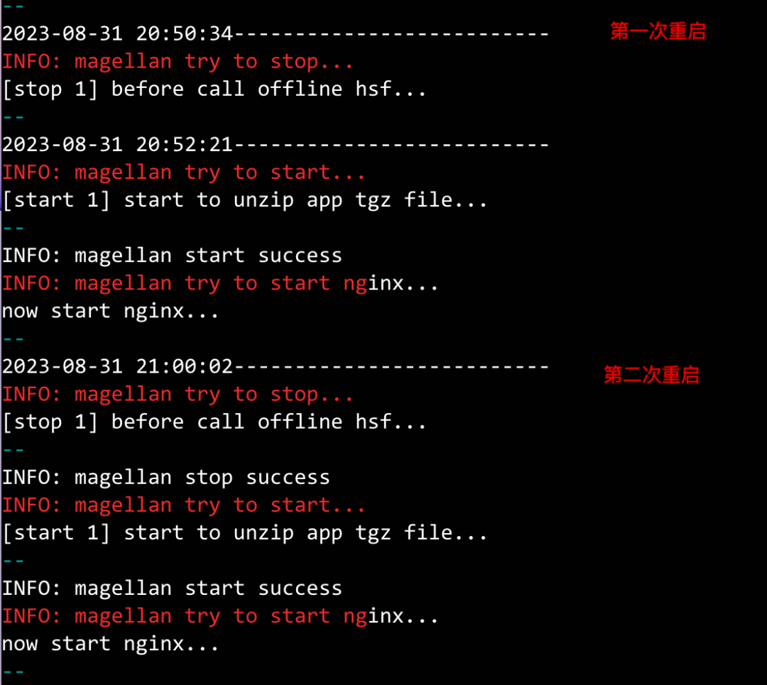 cat magellan_deploy.log |grep -E "INFO: magellan try to stop...|INFO: magellan try to start..." -C 1
