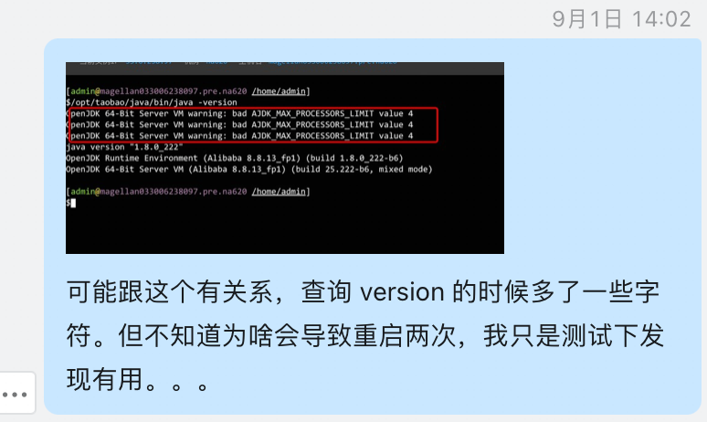 虽然不影响启动参数,但部署日志里,有这么多的这行错误日志,而且 JDK 版本获取错误估计也会引起一些不可知的问题。先修复掉试试!