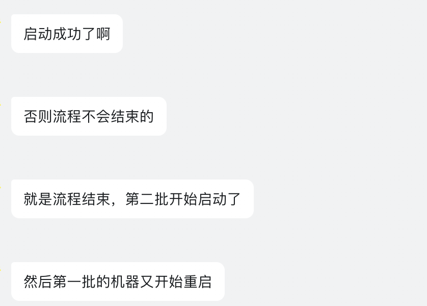当然上面这命令,也只是此刻我梳理整体过程时才想起来(所以跟开发同学提供的截图不太一致),排查问题时也就大概看看日志。不过通过上面的图,我倒是又发现了一个之前遗漏的点:两个机器的第一次启动时间不一样(分 2 批启动,机器 1 是第一批启动,机器 2 是第二批启动),但是他们第二次的重启时间是一样的,都是 21:00:02 ,说明是同一时刻被调度的,这也印证了后面的结论,不过,目前我们暂且忽略该信息。