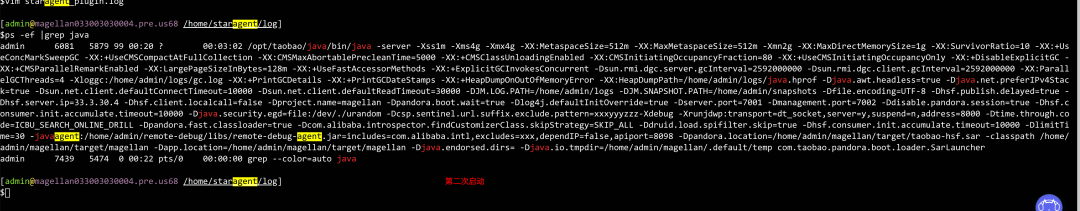 果然,第二次多了 -javaagent:/home/admin/remote-debug/libs/remote-debug-agent.jar!