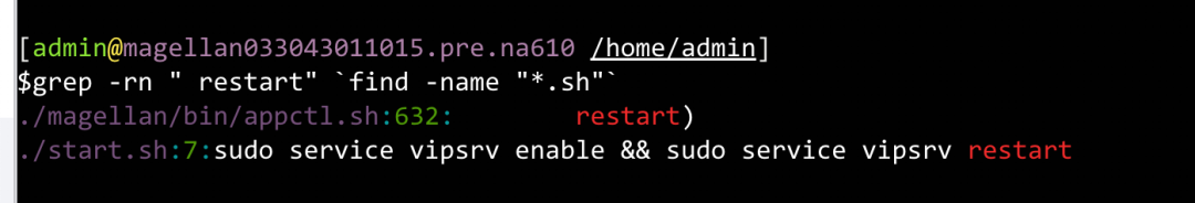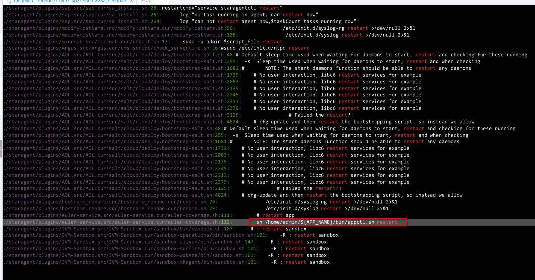 为什么这个方法可以呢?因为看部署日志,一定是执行了应用启动脚本 appctrl.sh 里的 restart 命令,所以一定含有“appctrl.sh restart” 或“ restart”关键字。