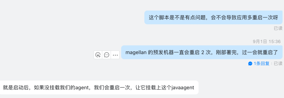 他们期望,在不需要开发同学修改代码的前提下,应用预发部署的时候就可以挂载这个 Java Agent,辅助他们采集一些数据。但他们研究了之后,发现无法做到在应用启动前就修改启动脚本里的 JVM 参数,所以只好采取了重启的方式。每 10 分钟左右调度一次,所以才会出现启动 5 分钟后突然重启的现象。他们以为应用启动一般比较快,对开发的影响较小。
