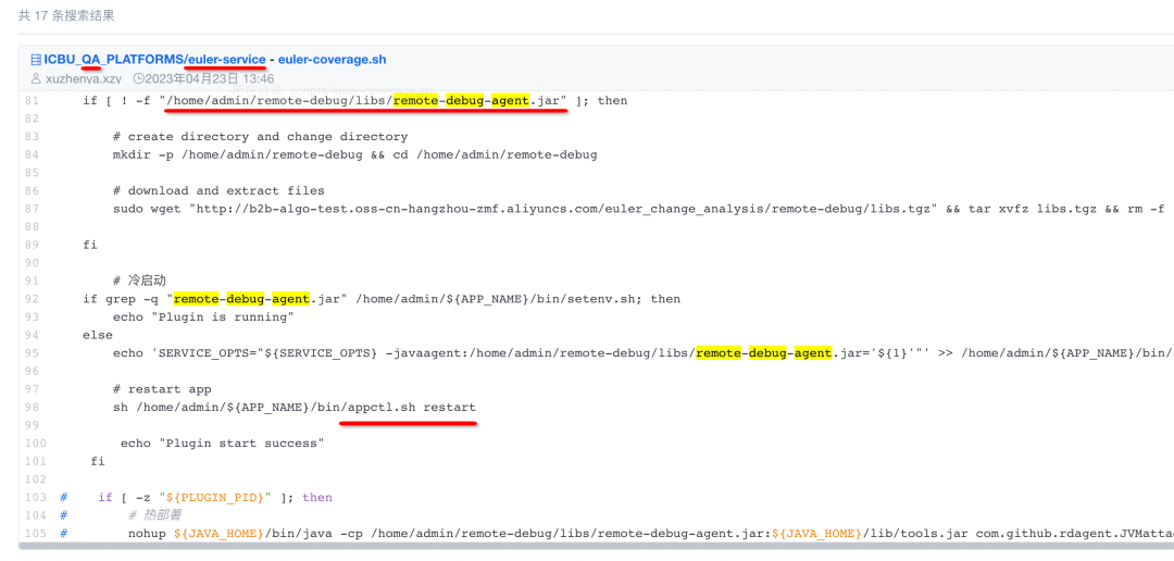 代码搜索(阿里内部代码仓库搜索平台)下吧,不过这次我为了更精确的匹配使用了关键词“remote-debug-agent”,有戏!