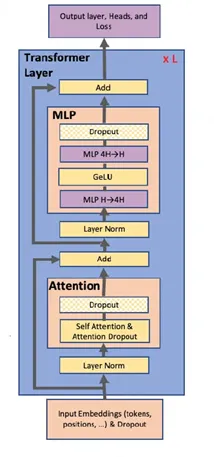 Transformer 层由一个自注意力模块(self-attention block)后跟一个两层的多层感知机(MLP)实现的。