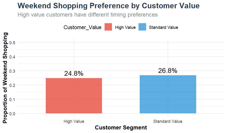 高价值客户的周末购物占比较低(24.8%),明显低于标准价值客户(26.8%)。这说明高价值客户的消费行为更倾向于工作日、节奏更稳定,而标准价值客户更受周末时间影响。营销上可在工作日针对高价值客户推出个性化促销或会员专属活动,以稳住高贡献群体;周末则更适合面向标准价值客户进行大众化引流与折扣活动。