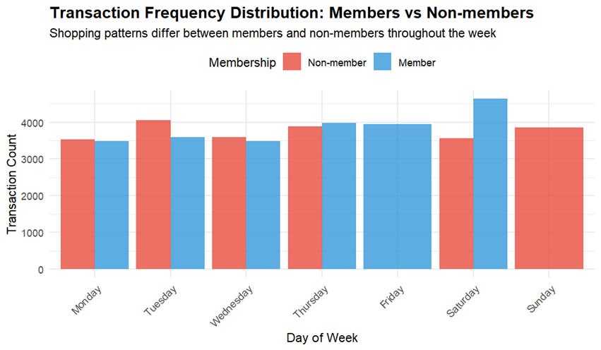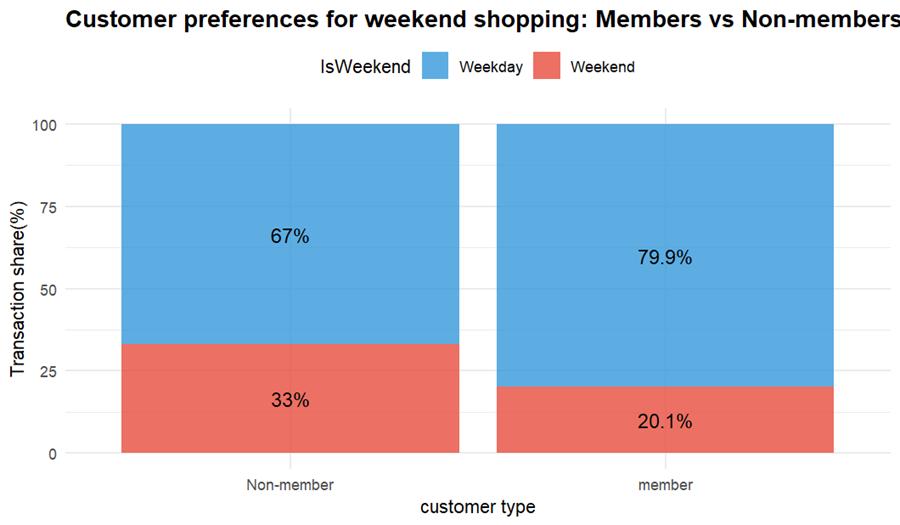 非会员的购物行为更随意,大概三分之一的交易发生在周末,说明他们更可能在休息日顺便购物。相比之下,会员的购物模式更稳定,他们有将近 80% 的交易发生在工作日,几乎不会把购物集中在周末。这表明会员更倾向于在日常生活中进行计划性的采购,而非会员的购物更接近“周末顺道买点东西”的形式。