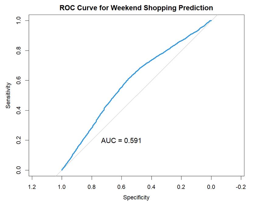 模型的 AUC 为 0.591,说明其预测周末购物的能力有限,仅略高于随机水平。换言之,购物篮规模、商品单价与会员身份虽然在统计上与周末购物存在显著关联,但这些变量的解释力不足以构建高准确度的预测模型。这一结果表明:顾客选择在周末或工作日购物并不主要由购买特征驱动,而更多是受个体时间安排、生活方式等外部因素影响。
