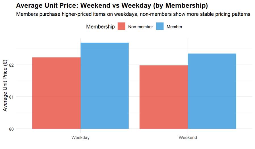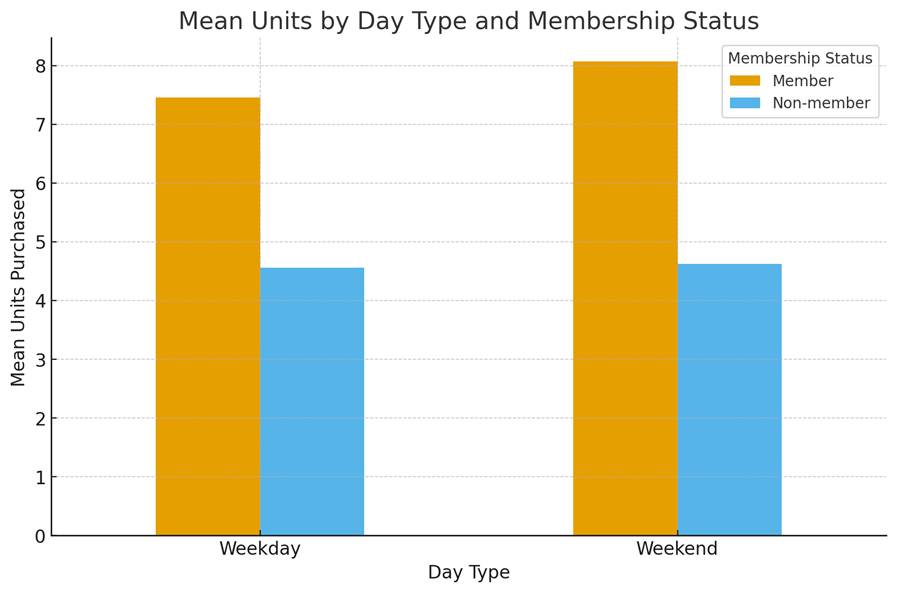 会员在工作日购买的商品平均单价明显更高,说明他们更倾向于在工作日进行计划性、价值更高的消费。到了周末,会员平均单价下降,可能转向补货、简单采购等日常购物。相比之下,非会员的消费单价在周末和工作日之间几乎没有变化,显示其购物模式更随性、更价格敏感度较低,于此同时也缺乏明显的‘高价值购物时段’。这意味着,针对会员的高价位产品促销更适合放在工作日,而针对非会员的推广活动则不必过度区分时间。