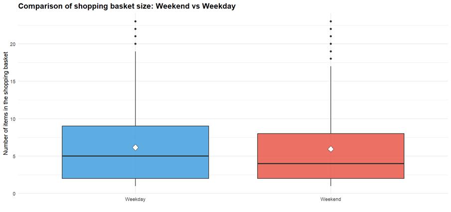 这张箱线图显示,虽然工作日与周末的购物篮规模在中位数与整体波动程度上相似,但周末的平均值略高,并且出现更多的高值离群点。这表示大多数顾客在周末与工作日的购买数量相近,但仍有一部分顾客会在周末进行更大规模、成批量的购物。