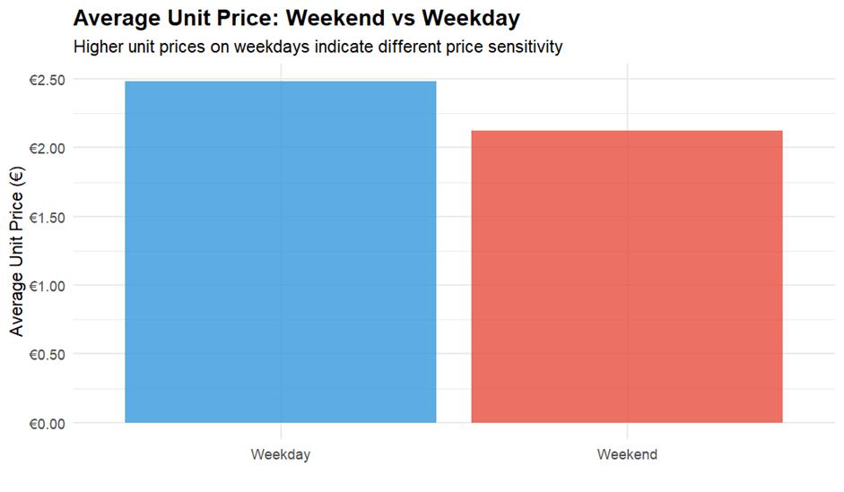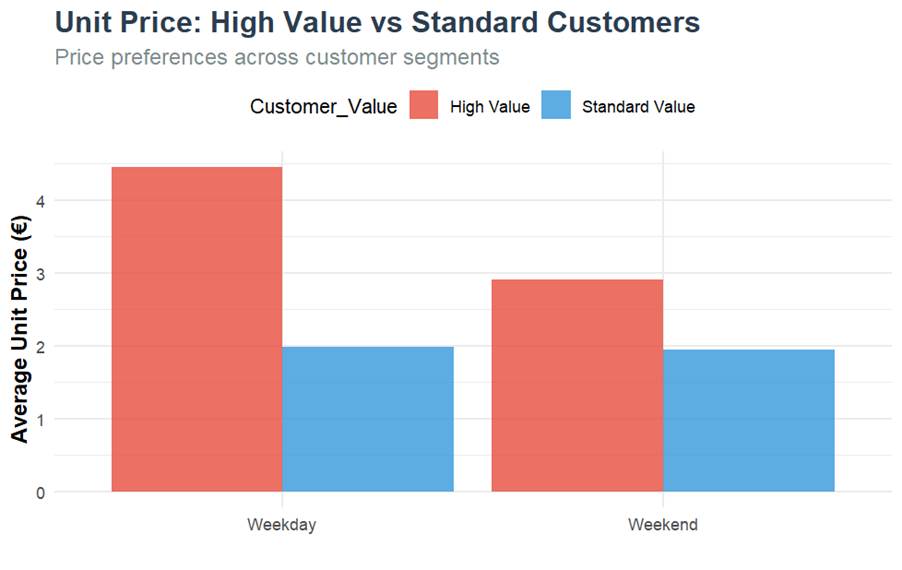 高价值客户不仅购买量更大(basket size 高出 2–3 倍),在商品选择上也更倾向于高单价产品,是盈利能力最强、最关键的一群顾客。他们在周末与工作日的价格表现虽有变化,但整体仍显著高于其他客户。标准价值客户的消费偏好以低价、刚需品为主,几乎不随时间变化。营销策略上应将高价值客户视为“可提升型 Premium Segment”,给予个性化推荐与高端品类的定向推广;而标准客户更适合以折扣、组合促销驱动成交。