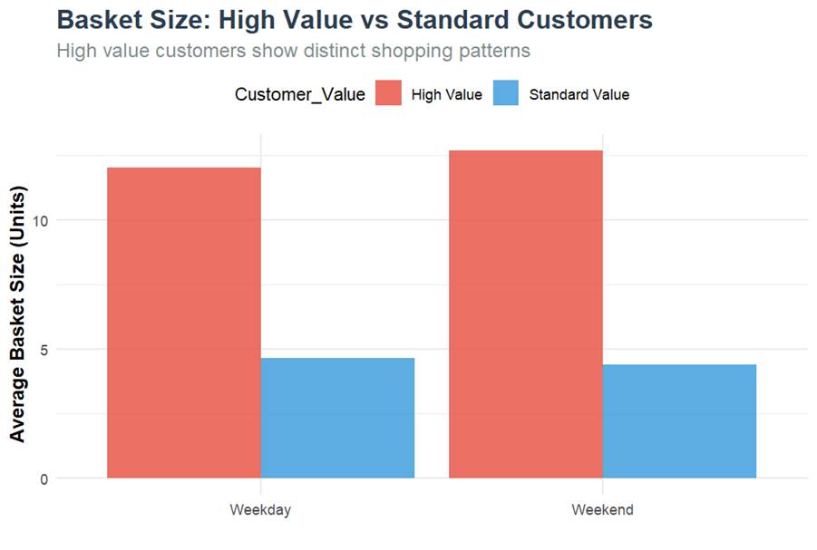 从图中可以看出,高价值客户的购物篮规模远高于标准客户,他们是整体销量贡献的核心群体。他们在工作日与周末的购买量保持一致,属于稳定高消费用户,相反的是标准价值客户无论在何时段购买的数量都较低且差异不明显。策略上应重点维系高价值客户,通过会员计划、个性化优惠或提前推送高价值产品,以进一步提升其贡献;同时对标准用户可以通过周末促销引导增加购买量。