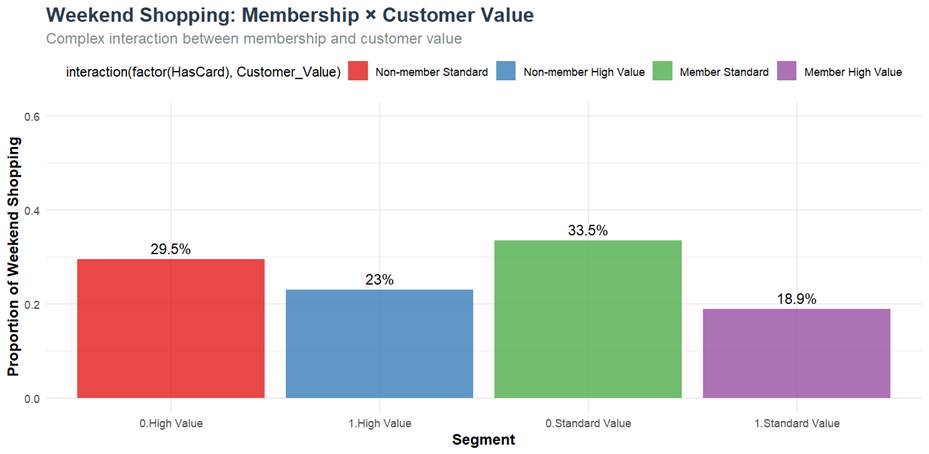 分析结果显示,会员与客户价值对周末购物存在明显交互效应。非会员无论价值高低都更偏向周末购物,尤其是标准用户(33.5%)。相比之下,会员明显倾向在工作日购物,其中标准会员周末比例最低(18.9%)。此外,高价值客户在两个会员组中都表现出更低的周末购物比例,说明其消费行为更规律、更稳定。整体来看,周末营销活动更适合面向非会员和标准价值客户,而工作日营销应重点服务高价值会员群体。