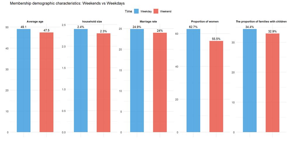 1)工作日购物的会员更“家庭型”:女性更多、年龄略大、有孩家庭比例更高;