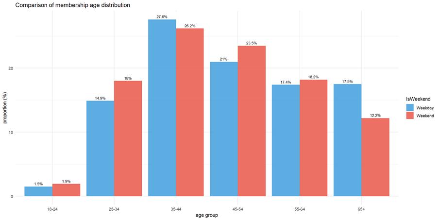 年龄结构显示会员整体以 35–54 岁为核心,但不同年龄段在“工作日 vs 周末”的选择上呈现分化趋势:年轻会员(18–34)明显偏向周末购物,而年长会员(65+)显著偏向工作日购物。中间段(35–64)占比最高,但其中 45–54 岁与 55–64 岁在周末的占比也有所抬升。这说明周末更适合触达年轻与中年家庭客群,而工作日则是高龄客群与高价值会员的主要活跃时段,可据此制定更精准的时间分段营销策略。