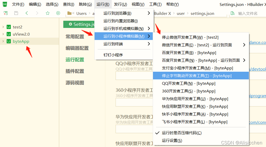 本文详细介绍了如何使用uni-app在字节跳动和微信平台启动小程序。首先,在Hbuild X中设置运行位置以启动字节小程序,通过复制地址并导入到字节小程序平台。接着,配置微信小程序的运行设置,调整安全设置,最后在Hbuild X运行uni-app项目,微信小程序将自动启动。