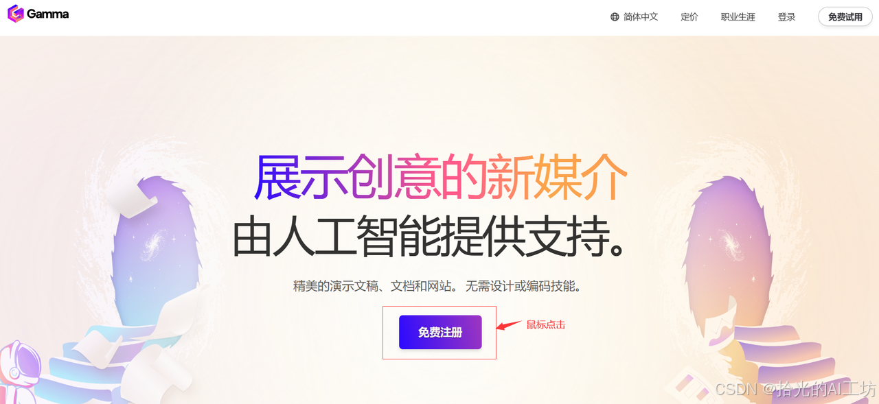 浏览器地址栏输入https://gamma.app/进入Gamma官网,点击“免费注册”创建Gamma账号
