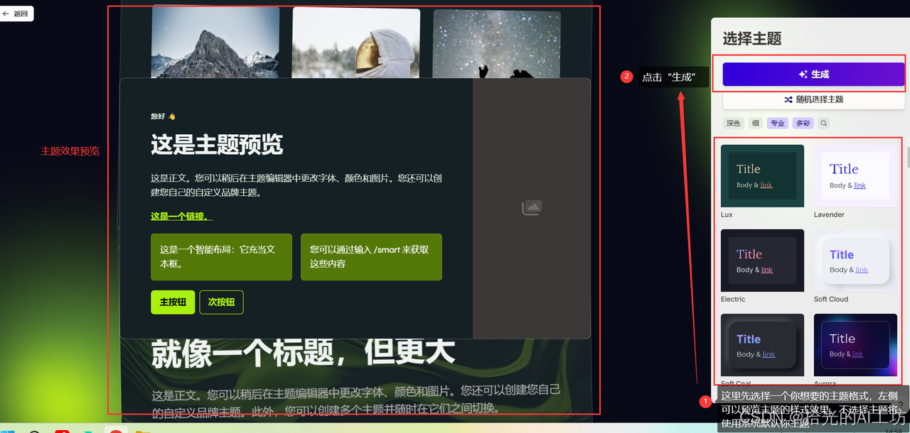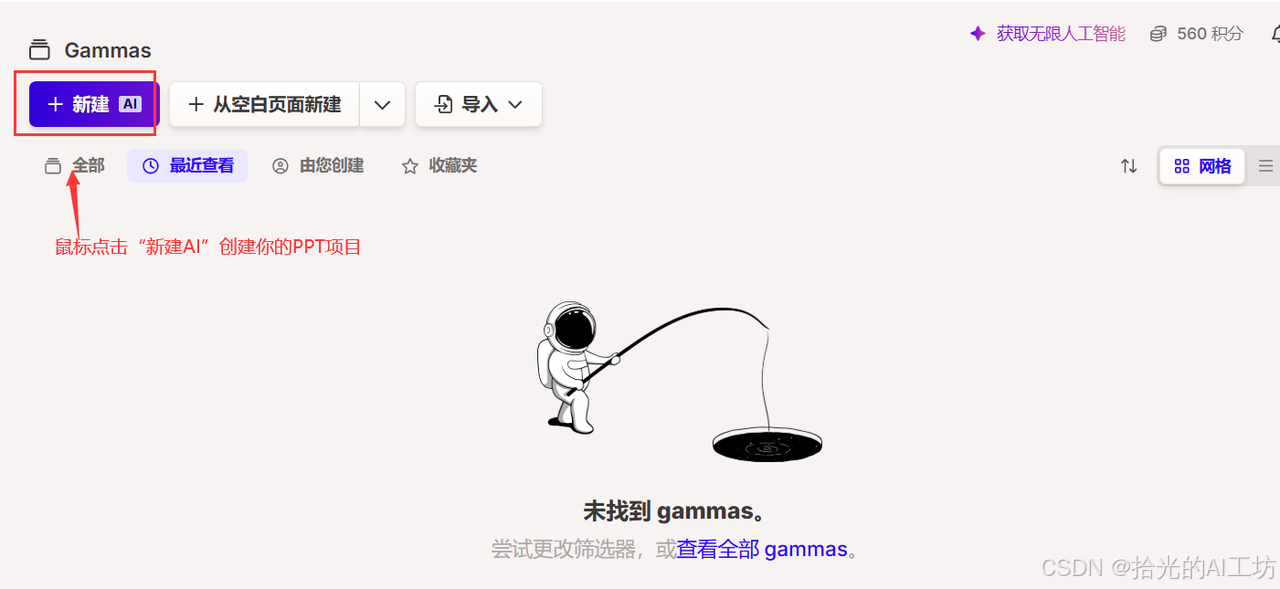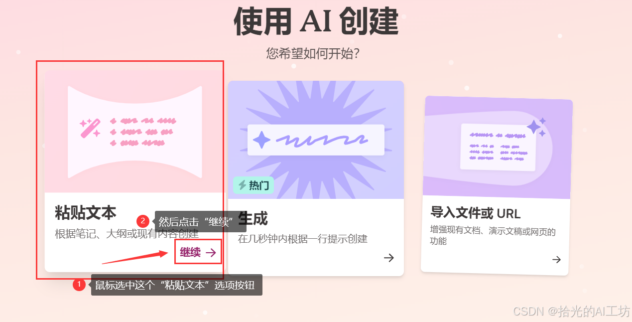 点击“新建AI”按钮,创建一个项目,然后进入PPT生成模式选择页,这里的操作如下: