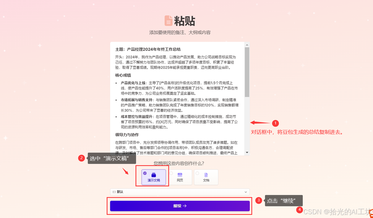 将上一步豆包【帮你写作】生成的年终总结复制到文本输入框,点击“继续”进入下一步。