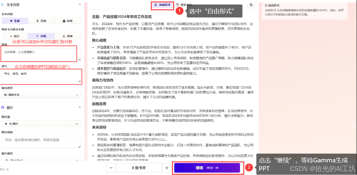 这里可以设置Gamma生成PPT的一些细节,如“汇报的对象”、“PPT的语气”等个性化需求。