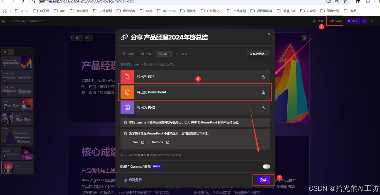 点击右上角“分享”按钮进入PPT导出详情设置页,这里选择“导出到PowerPoint"格式,点击“完成”即可将生成的年终总结PPT保存到本地电脑。