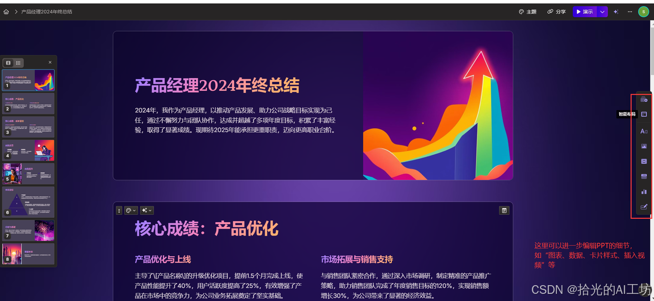 等待3秒左右,Gamma将自动根据你的“年终总结文本、设置的主题样式”生成最合适的PPT文稿。