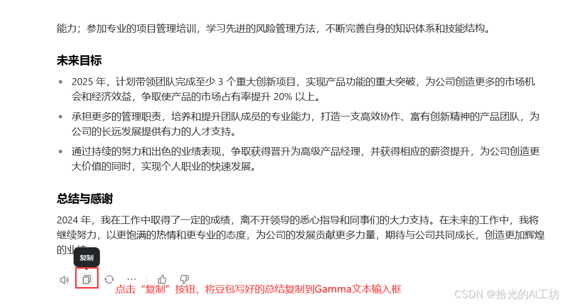 这里,豆包【帮你写作】根据设置的工作岗位和年终总结的定制要求自动生成总结文稿内容,Gamma负责PPT的自动生成,两个神器结合最终实现年终总结PPT的AI一键自动生成。