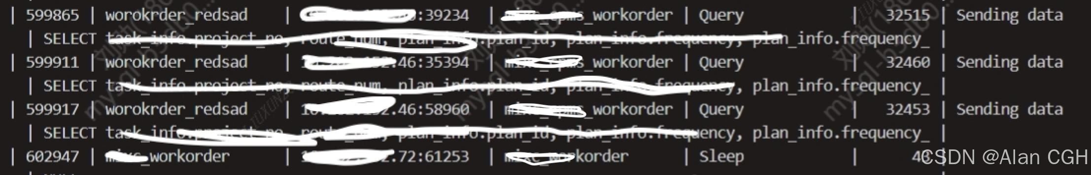 32515秒,这3条SQL就是某个同事下午执行的查询报表的语句。sending data代表SQL正在执行,边读数据边放到MySQL的send buf中,此时不一定是在发送数据给客户端,也有可能是在等锁。