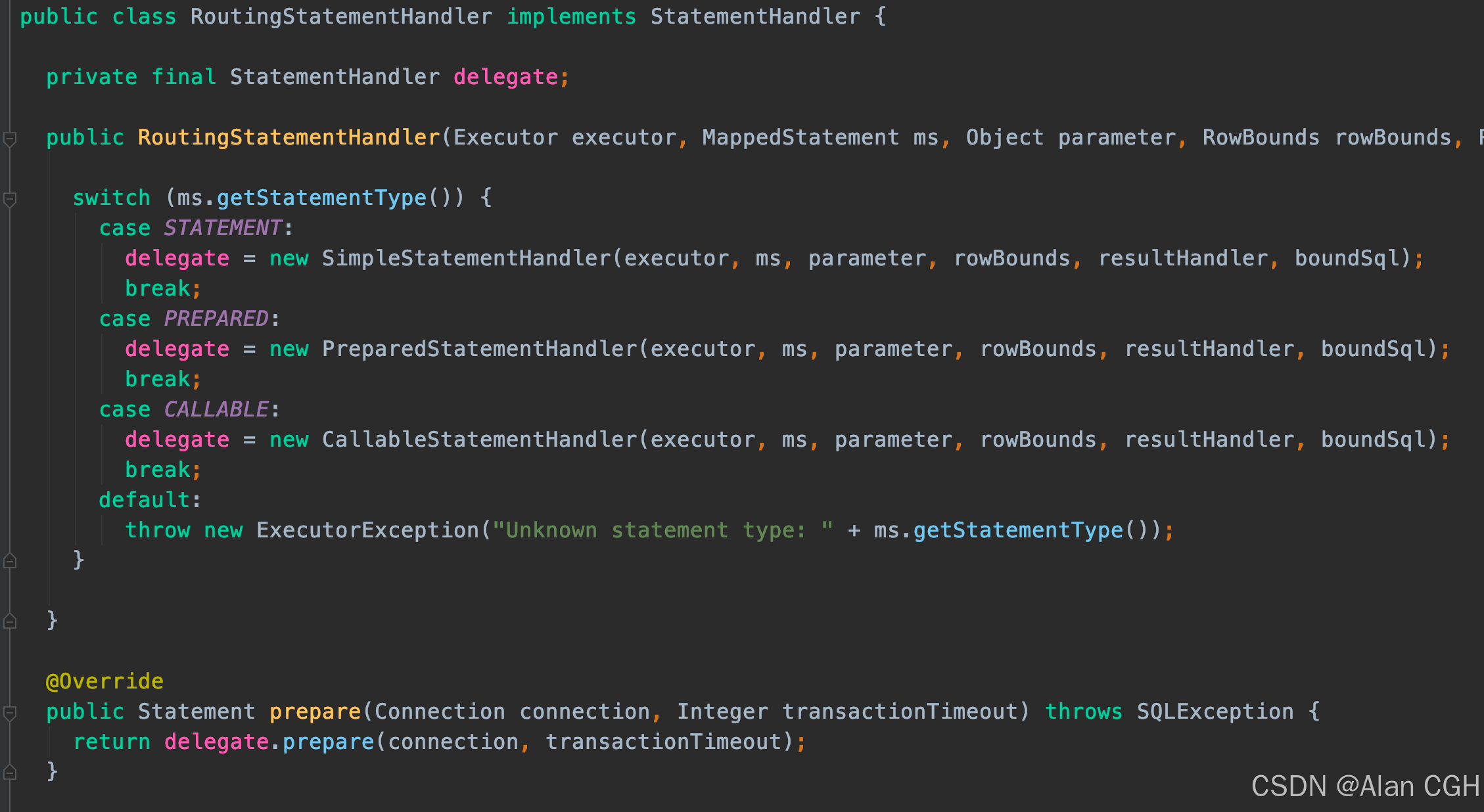 - RoutingStatementHandler 是负责根据当前 mappedStatement 即上面说的sql语句类型选择一个合适的处理器执行的路由功能的对象。