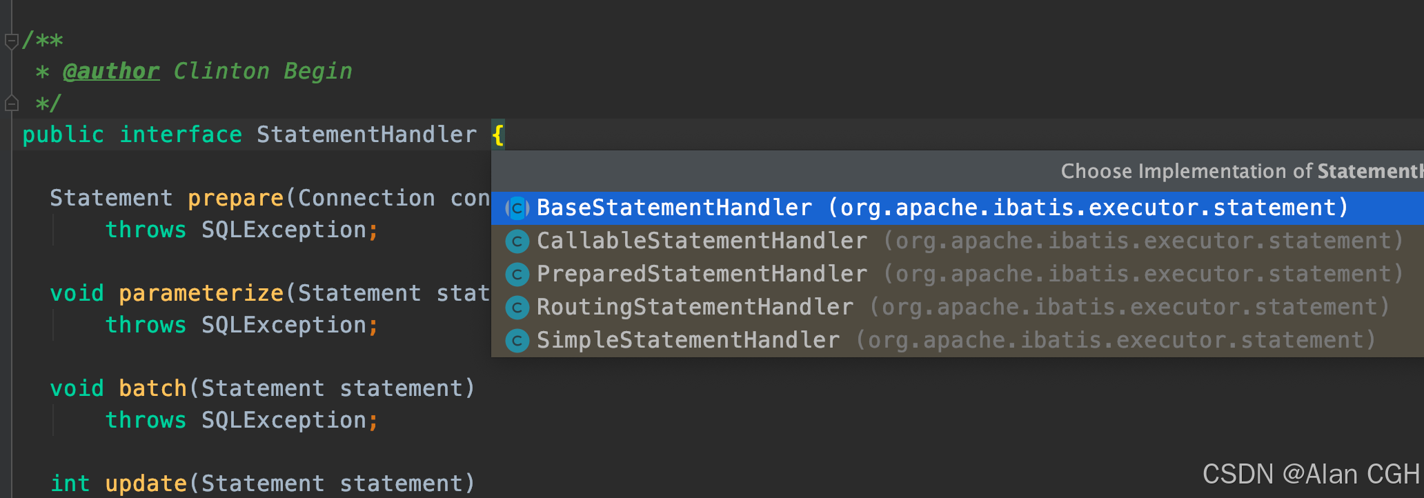 先来认识下 StatementHandler 接口及其实现类,跟Executor是一样的结构。这个接口看名字就知道是对sql语句进行管理的处理器对象。