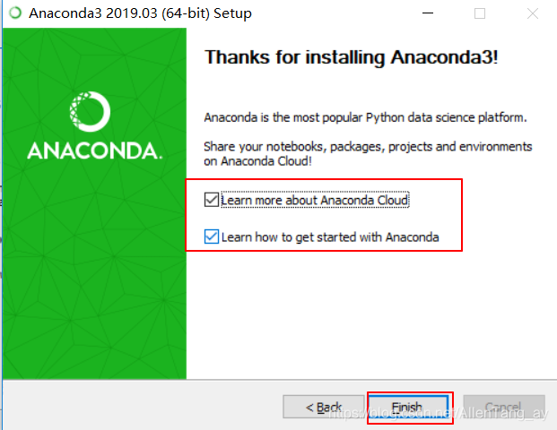 最后点击Finish,我们的安装就完成啦~(框中的两个选项可以不勾选,勾选了会在浏览器跳转到相应的网站查看说明)