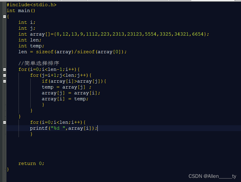昨天学习了冒泡法排序,而今天学习的简单选择排序与之不同,(冒泡法的参数是列与列的比较,而简单选择法,是行列比较)简单选择排序是把最大的放在前面不断的去比较,他行初始值0,最大值len-1,而他的列应该是初始值应该是i+1,最大值len(j总是能访问到尾巴所以是len)。