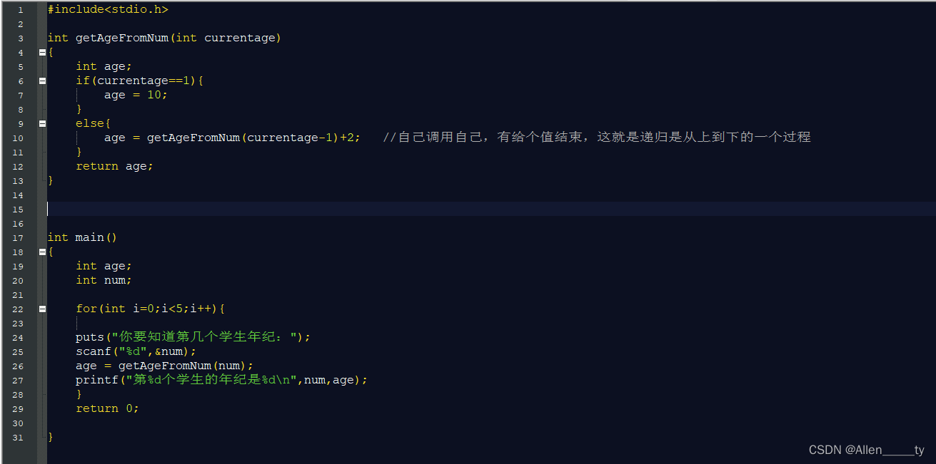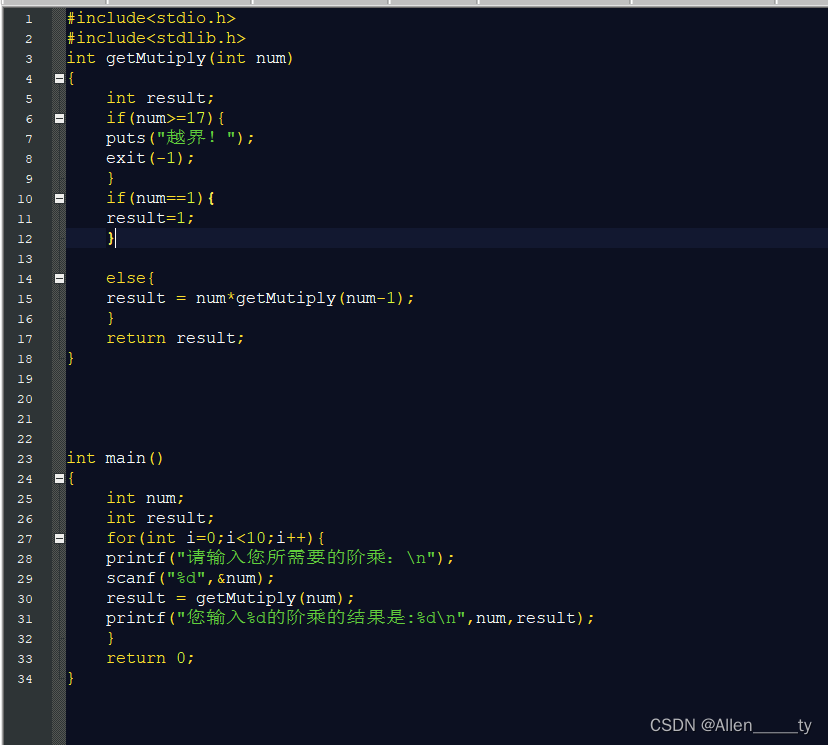今天做了阶乘和获取年龄得代码。下面附上代码(第二个得时候在17出现了越界,原因在于int的储存有但17的阶乘就越界了)