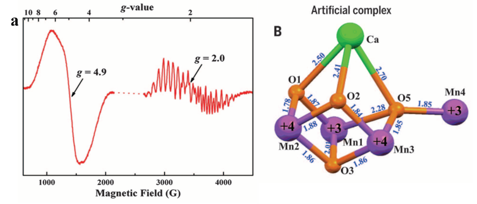 图八、人工合成的Mn4CaO5簇合物催化剂在水氧化过程中的S2态的EPR谱图(a)以及其基态结构示意图(b)