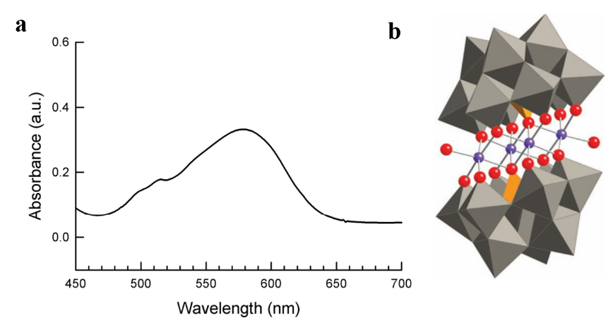 日本分子科学研究所的Shigeyuki Masaoka 团队在Nature上发表了水氧化TOF高达1900 s-1的分子催化剂Fe5,研究使用紫外可见吸收光谱证明了分子催化剂的稳定性。(Nature,530, 465–468)。美国埃默里大学的Craig L. Hill教授团队在Science(Science, DOI:10.1126/science.1185372)上发表了第一例廉价过渡金属Co4POM析氧催化剂,图五是其紫外可见吸收光谱及结构示意图。