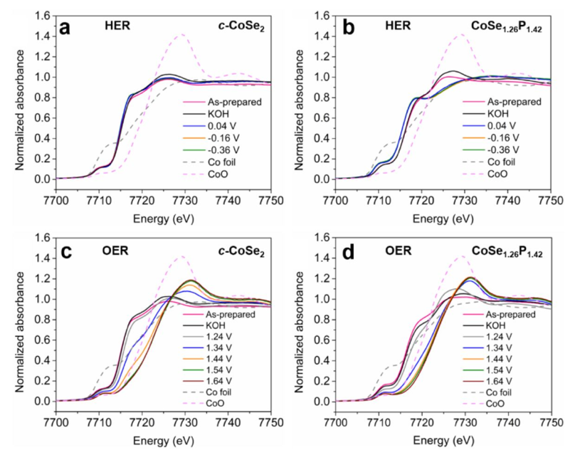 (a)c-CoSe2和(b)CoSe1.26P1.42在HER过程的各种电位下的原位Co K边缘XANE光谱,(c)c-CoSe2和(d)CoSe1.26P1.42在OER过程的各种电位下的原位Co K边缘XANE光谱。