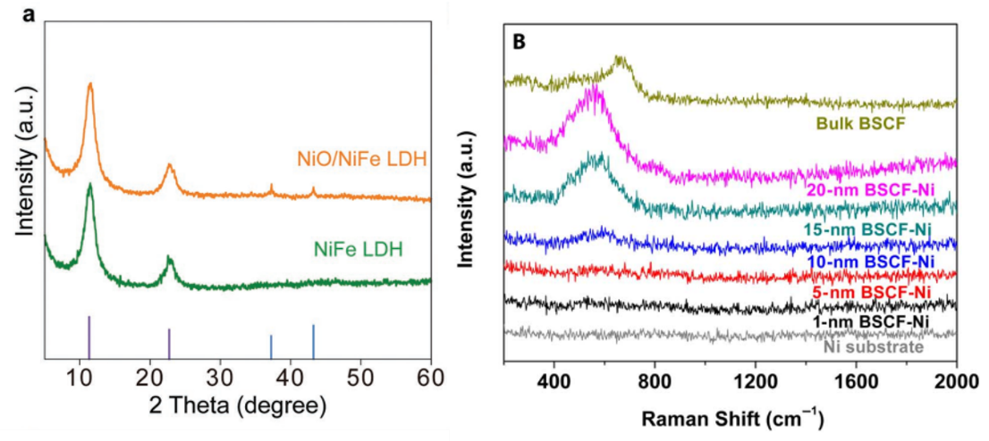 几乎每篇多相水裂解催化剂研究文章都有XRD表征,这里列出天津大学杜希文教授课题组发表在Adv. Mater.( Engineering NiO/NiFe LDH Intersection to Bypass Scaling Relationship for Oxygen Evolution Reaction via Dynamic Tridimensional Adsorption of Intermediates. DOI: 10.1002/adma.201804769)上的一篇文章(图三a)。图三a中测定了NiO/NiFe LDH和NiFeLDH的XRD,确定了NiO/NiFe LDH的结构。本研究中NiO/NiFe LDH负载在泡沫Cu电极上后在1M KOH电解液中水氧化的电流密度达到30 mA cm-2时仅需要205 mV的过电势,性能十分强劲。