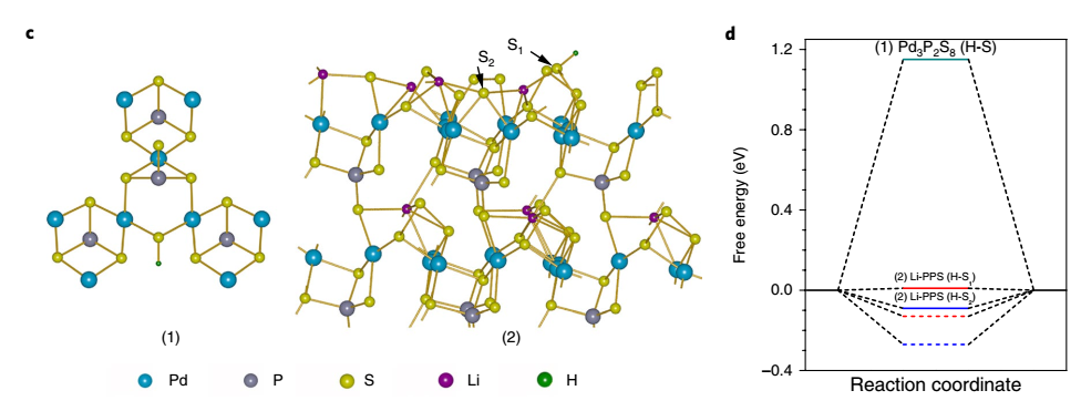 南洋理工大学的张华教授课题组在Nat. Catal.上发表了题为“Lithiation-induced amorphization of Pd3P2S8 for highly efficient hydrogen evolution”的文章。作者们表明对层状结晶Pd3P2S8的锂化诱导的非晶化激活了这种电化学惰性材料,使其成为作为高效的析氢催化剂。层状Pd3P2S8晶体的电化学锂化导致形成具有大量空位的无定形锂掺入的钯磷硫化物纳米点。实验和理论研究表明,Pd3P2S8的形态和结构的调整(例如,尺寸减小,结晶度损失,空位形成和锂掺入)有助于其固有的惰性电催化性质的活化。文章使用DFT计算说明了Li-PPS材料的具有更佳的HER性能的原因是其H在催化剂上S位点的吸附更加适中。