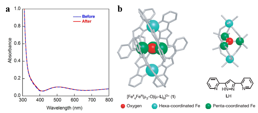 图四、Fe5分子催化剂反应前后的紫外可见吸收光谱及其结构示意图