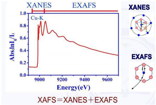 XAFS即X-ray absorption Fine Structure中文名称为X 射线吸收精细结构。所谓的精细结构即是指X射线吸收光谱在吸收边附近及其高能量端存在一些分立的峰或波状起伏。如图九,XAFS包括XANES(X-ray absorption near edge structure, X射线吸收近边结构)和EXAFS(扩展X射线吸收精细结构谱, Extend X-ray Absorption Fine Structure)(两者并无严格界限),两者的划分依据主要是依据精细结构从吸收边前至高能延伸段约1000eV中谱图形成机制(多重散射与单次散射)的不同。XANES的范围一般为吸收边前-吸收边后50eV。其特点有:振荡剧烈(吸收信号清晰,易于测量);谱采集时间短,适合于时间分辨实验;对价态、未占据电子态和电荷转移等化学信息敏感;对温度依懒性很弱,可用于高温原位化学实验; 具有简单的“指纹效应”,可快速鉴别元素的化学种类。EXAFS的范围一般为吸收边后50eV - 1000eV。其谱线特点有:可以得到中心原子与配位原子的键长、配位数、无序度等信息。不过,EXAFS对立体结构并不敏感。值得指出的是,EXAFS可以用来对无定形材料的结构进行表征确定。