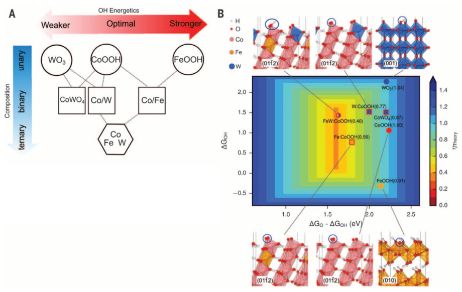 加拿大多伦多大学的Edward H. Sargent教授课题组在Science上发表了题为“Homogeneously dispersed multimetal oxygen-evolving catalysts”的文章。研究者们使用密度泛函理论研究表明,非3d高价金属如钨可以调节3d金属氧化物,为OER中间体提供接近最佳的吸附能。 我们开发了一种室温合成法,以生产具有原子均匀金属分布的胶凝羟基氧化物材料。这些凝胶化的FeCoW羟基氧化物在碱性电解质中以10毫安/平方厘米报告了最低的过电位(191毫伏)。 在超过500小时的操作后,催化剂没有显示出降解的迹象。 X射线吸收和计算研究揭示了钨,铁和钴之间的协同相互作用,产生了有利的局部协调环境和电子结构,增强了OER的性能(图十三)。
