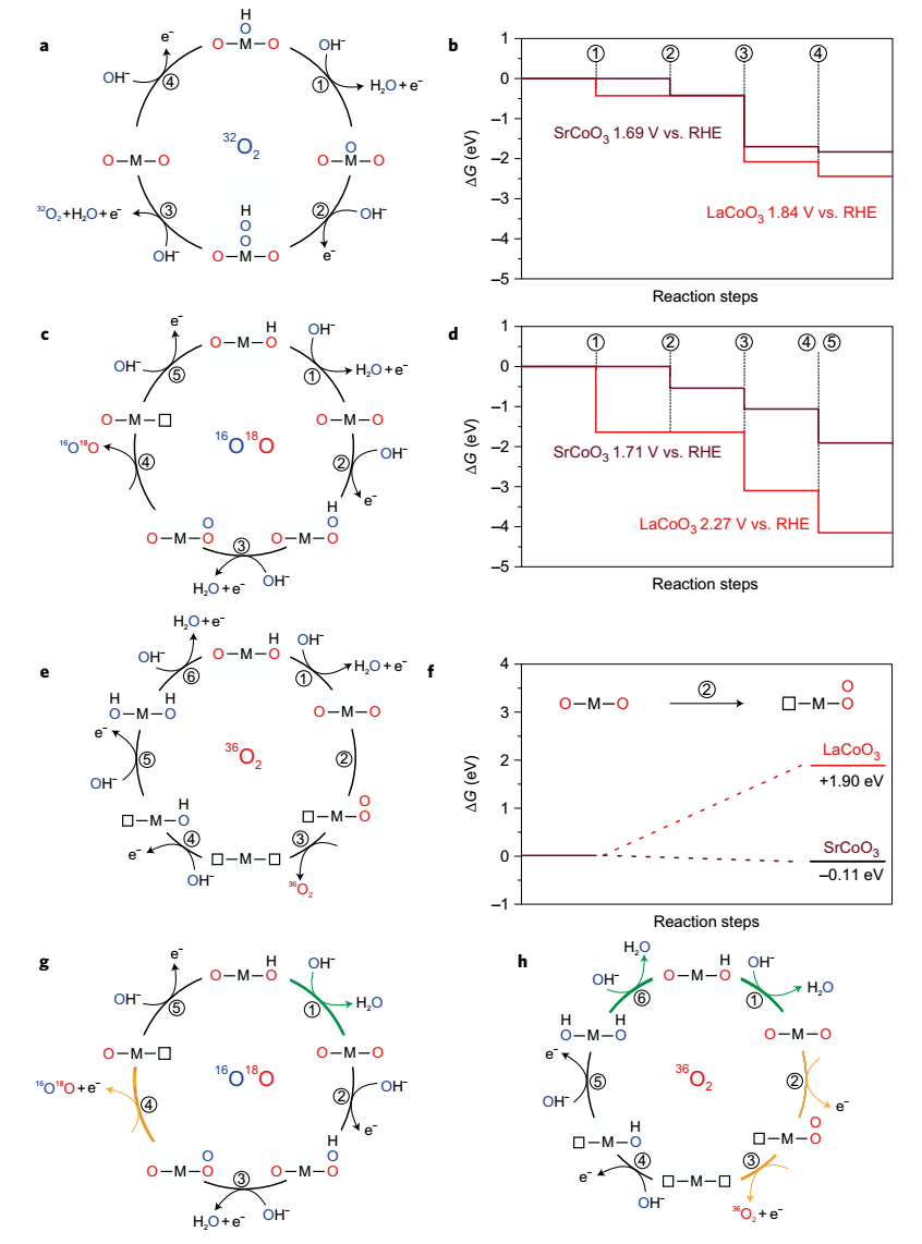 OER发生的主要影响因素有:1.水或者氢氧根在催化剂上的吸附;2.水或者氢氧根中O-H键的断裂;3.O-O键的形成;4.O2的脱附。