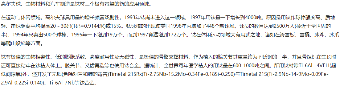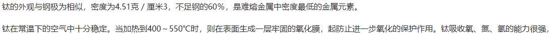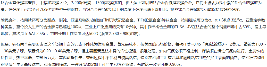 致密金属钛由于质量轻,比铝合金强度高,能在高温下保持比铝为高的强度而受到航空工业的高度重视。鉴于钛的密度为钢的57%,其比强度(强度/重量比或强度/密度比皆称比强度)高,抗腐蚀、抗氧化、抗疲劳能力均强,钛合金的3/4用作以航空结构合金为代表的结构材料,1/4主要用作耐蚀合金。