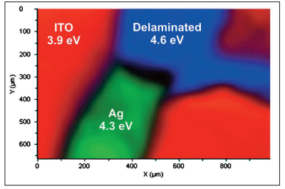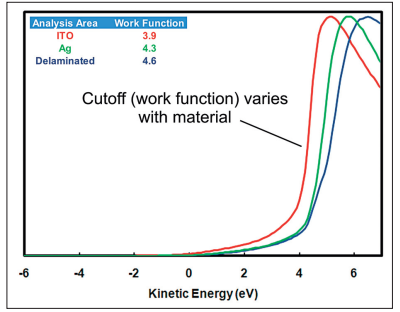 除去常见的对材料表面氧空位、碳原子或者氮原子缺陷位点的分析,XPS在缺陷分析中还有一个高大上的应用,那就是利用光电子能谱测量功函数,测量整个光谱范围光电子能谱,在低结合能和高结合能下测量截断能,由截断能和光子能量可以确定出功函数。使用50微米的X射线光斑收集信息,用PCA(Principal Component Analysis)算法就可以构建太阳能电池某损坏位置的实时光学视图。该方法极大依赖于光谱仪和光子能量校准的精确度,在K-Alpha XPS中,仪器会自动校准结合能,光子能量可以通过测量X射线诱导的俄歇峰的结合能位置来检查,以上校准过程仪器自动完成,所以XPS是一种研究失效太阳能电池脱出功面分布快捷直观的手段。