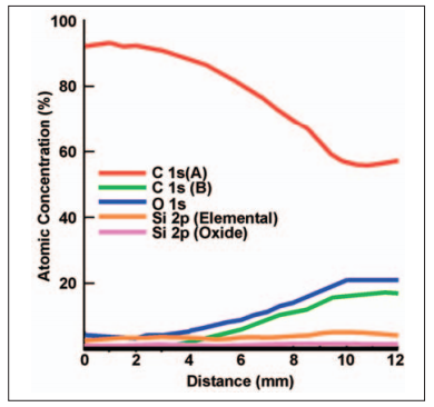 不同元素的原子百分比随分析位置的变化表明样品表面的烃类组分逐渐减少而含氧有机物组分逐渐增多,在样品的每一端,都有一段区域所有的组分保持不变。清晰地显示了沿线扫方向化学梯度的存在。