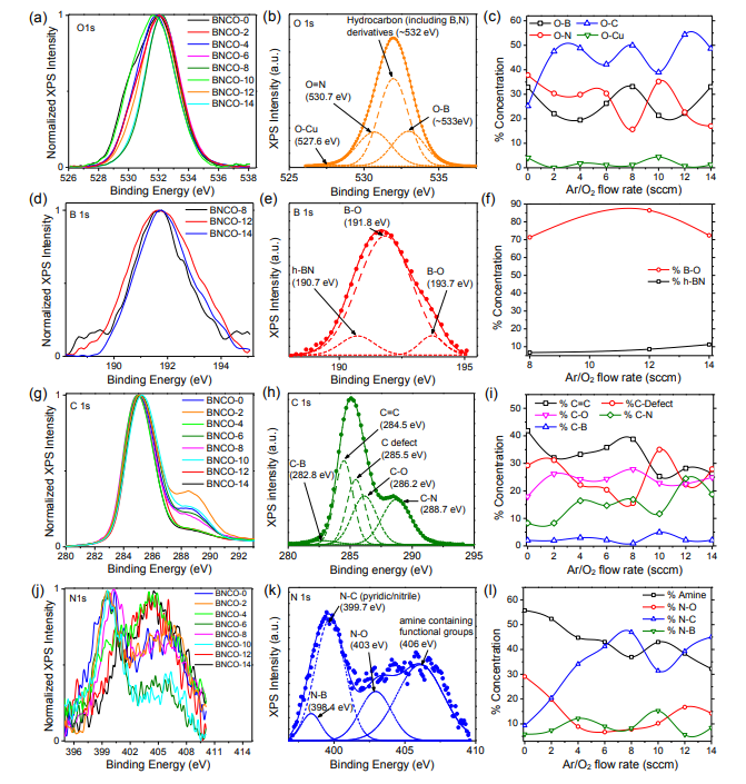 合金是一项强大的技术,它使各种半导体能够用于可调谐光学和电子器件阵列。XPS在一般合金中的作用是分析表面金属元素,都存在零价态证明其以合金形式存在,氧化态证明合金表面部分氧化。而Birol Ozturk等人首次将VI族元素(O)可调地结合到蜂窝状sp2型2D-BNC晶格中,制备出原子级厚度的硼,氮,碳,氧合金2D-BNCO,以XPS证明了氧原子主要与B,N,C键合,而基本不与基底结合。由于XPS光束尺寸比合成的2D-BNCO域大的多,无法获得单个BNCO域的XPS(即XPS信息包含BNCO域和BNC基材),他们创造性地将每种类型的键的百分含量作沉积过程中氧气流速的函数,探究相关化学键是位于其合成的2D-BNCO域内还是基材2D-BNC中,以一种创新的方式证明了氧元素的可调掺杂。该工作发表在Science Advances上[3]。