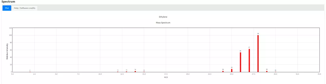 例如 C2H4,勾选 Mass spectrum,点击 Search,即可产生结果(若对应多种物质,会要求进一步选择)。